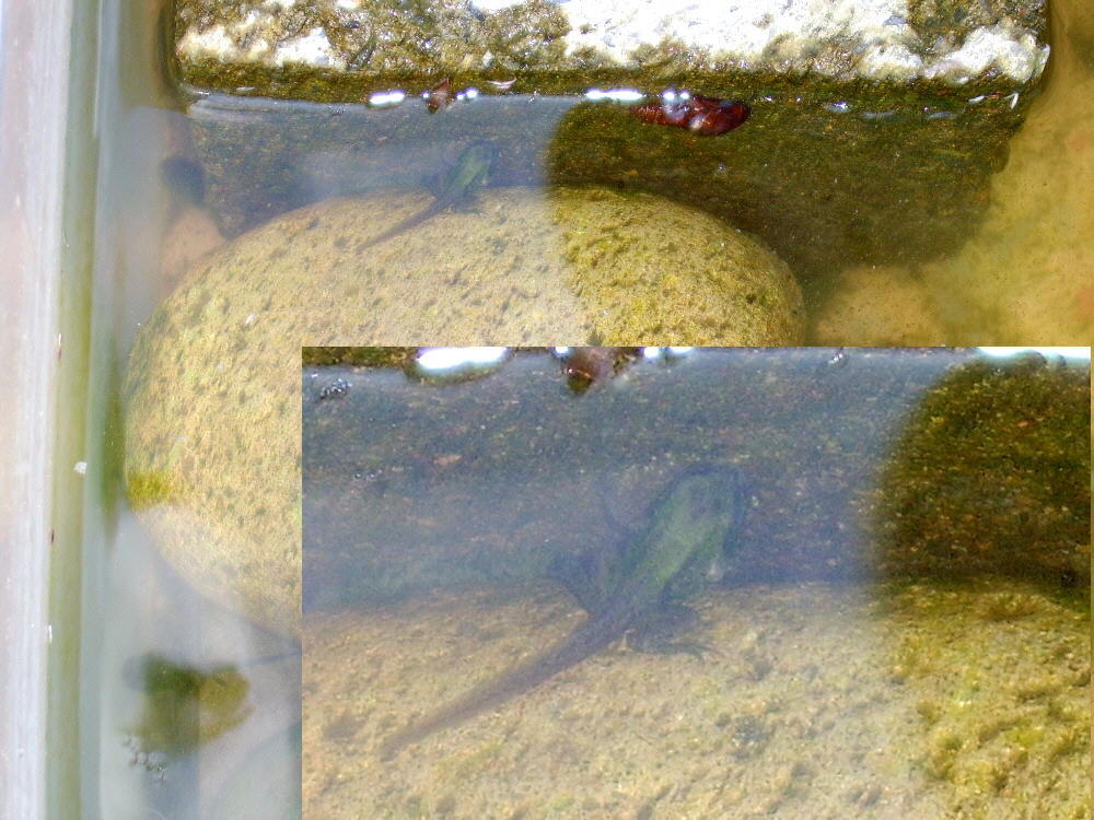 I’m also seeing signs that some of the tadpoles are becoming newts- the barest expression of gills; I can’t capture on camera yet. Soon