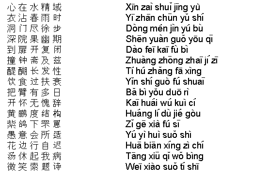 | Heart at water essence land Clothes wet spring rain time Penetrate gate utmost beyond step Deep court really tranquil appointment Reach door open again close Hit bell vegetarian meal at here Cream enhance develop nature Diet give support decline Hold arm be many days Open heart without shame evasion Golden oriole pass structure Purple dove descend lattice screen Humble think reach place suit Flower beside go self slow Tangxiu raise me sickness Smile ask write poem |
